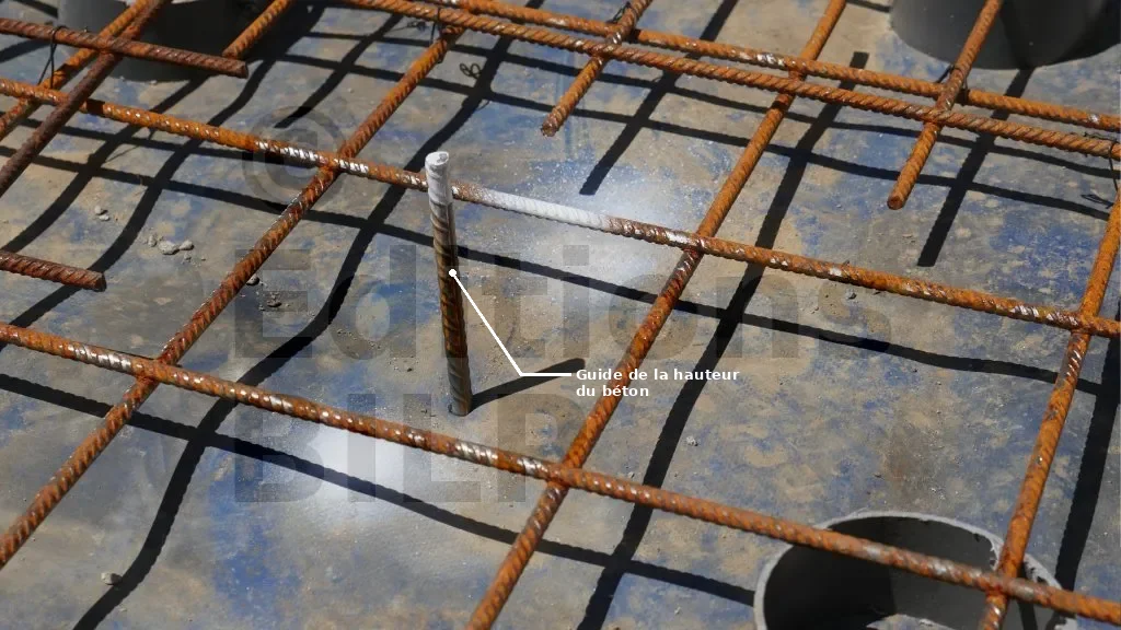 Mais avant de couler le béton, il faut placer les guides en bout de fer tous les trois mètre au maximum pour régler la hauteur du béton. Cela nous servira aussi lors du tirage de la règle (les finitions).