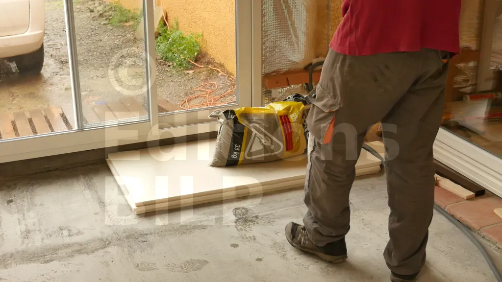 Vérifiez que la dalle est sèche, exempte de poussière, de moisissure et de saleté, plane et sans défaut. Si des défauts sont présents, effectuez un ragréage avec un mortier liquide et auto-nivelant. Laissez sécher le ragréage de la dalle pendant plusieurs jours avant de poser les plaques.