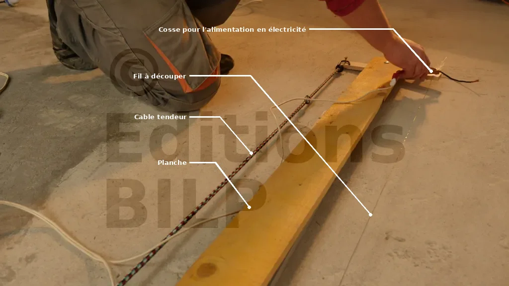 Cet outil offre une finition impeccable et sans bavures sur les polystyrènes et les mousses grâce à la chaleur produite par le passage du courant électrique sur le fil à découper et le poids de l’outil. Pour le fabriquer, il vous suffit de prendre deux lattes et de les fixer aux extrémités d’une autre planche pour former un H. Ensuite, fixez deux vis sur les extrémités hautes du H et attachez-y le fil à découper. Fixez également deux vis sur les extrémités basses des lattes et attachez-y un câble tendeur. Enfin, branchez les vis sur la partie haute du H à une alimentation électrique ou une batterie, un courant continu de 12 V fera bien l’affaire.