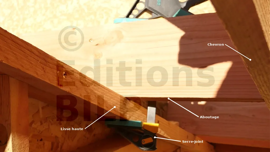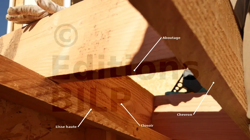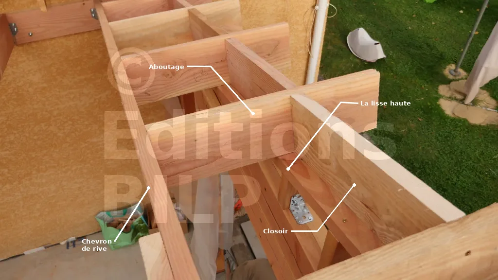 La structure des débords de toit est formée par des aboutages ayant la même section que les chevrons, et des closoirs qui maintiennent et ferment les espaces entre les aboutages. Ces aboutages sont fixés contre les chevrons de rive et prennent appui sur l’ossature des murs pour éviter qu’ils soient complètement en porte-à-faux.