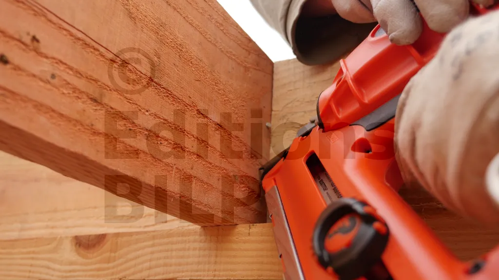 Les closoirs étant disposées en ligne, la fixation par vissage perpendiculaire avec l’aboutage n’est pas possible. Par conséquent, la fixation est réalisée avec des pointes inclinées à un angle de 45°.