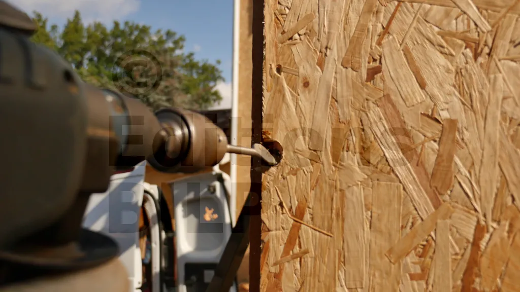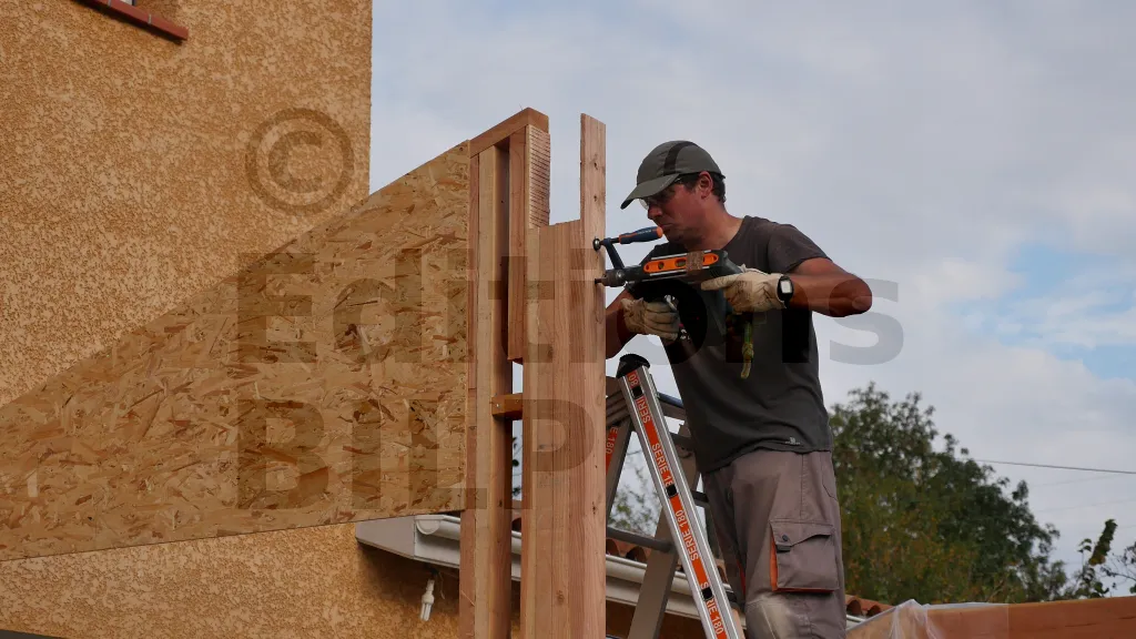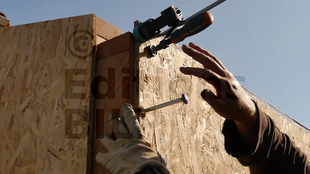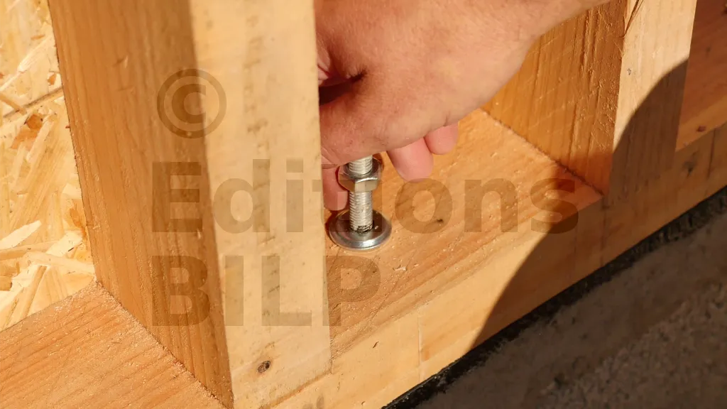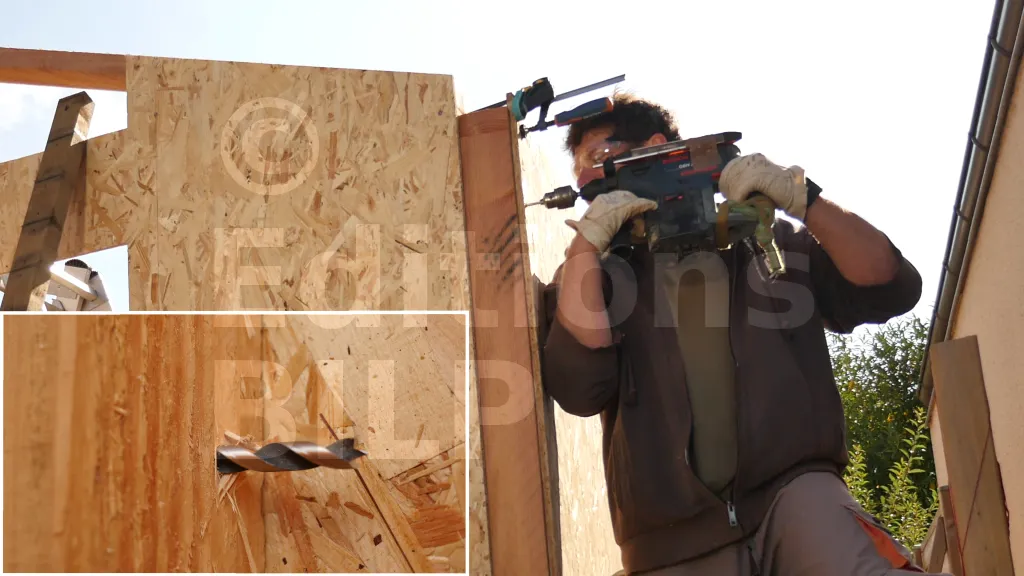 Pour ne pas gêner la pose des écrans pare-pluie, veillez à ce que les têtes des boulons ne dépassent pas les panneaux de contreventement (OSB). Pour cela, réalisez des trous borgnes.