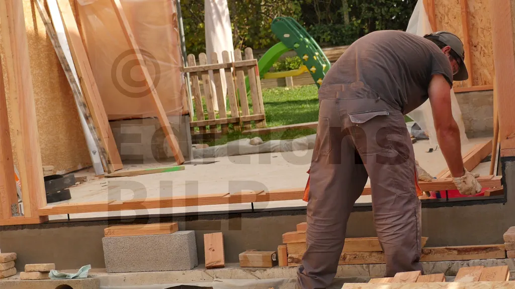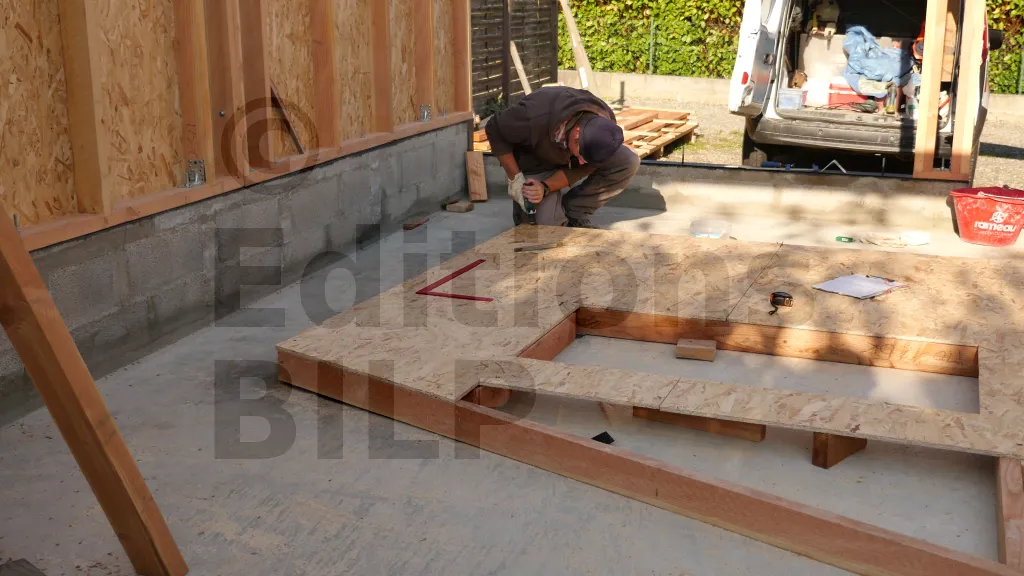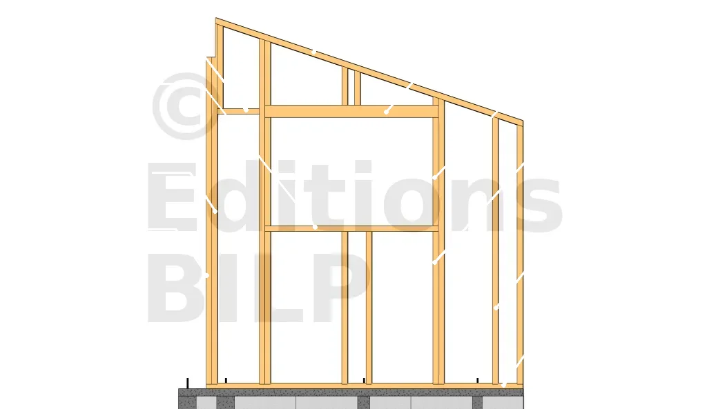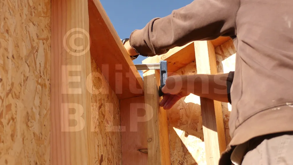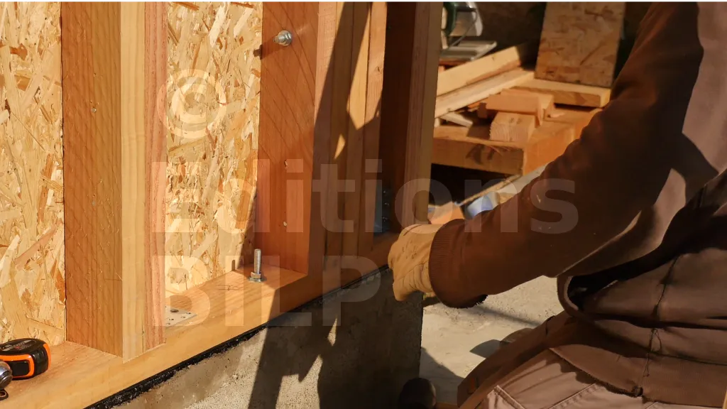La lisse basse est mise en place provisoirement afin de garantir une précision maximale lors de la réalisation des trous d’assemblage des deux panneaux du mur sur leurs montants.