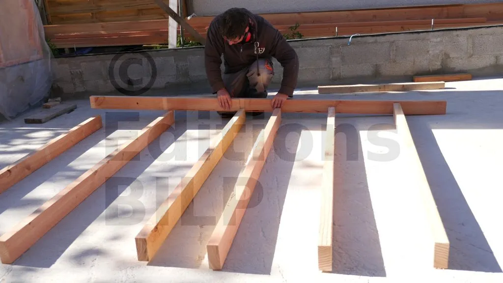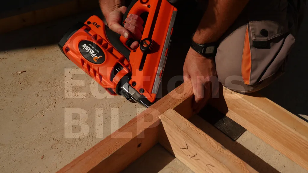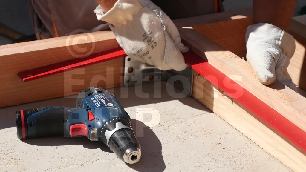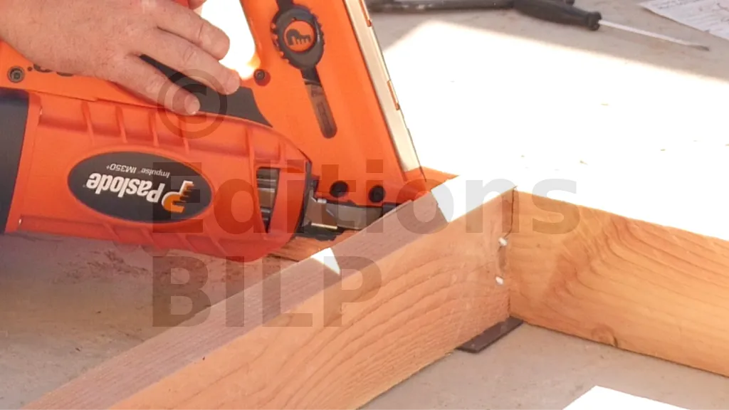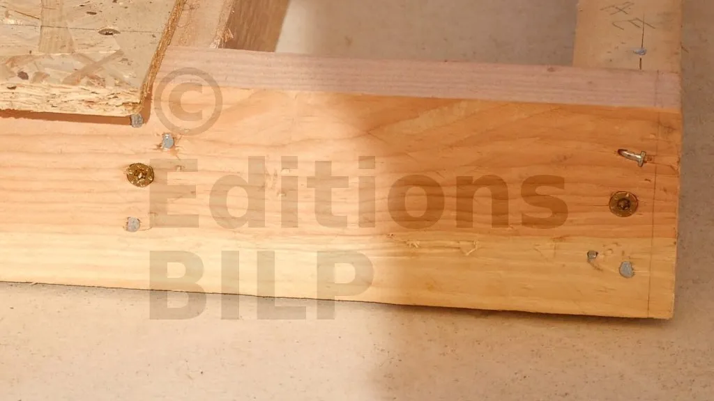 La lisse haute est fixée aux montants à l’aide de vis vis D8L100, renforcées par deux pointes D4L100 placées perpendiculairement à la lisse (par le haut) et quatre autres pointes D4L100 disposées en diagonale sur les deux côtés des montants.