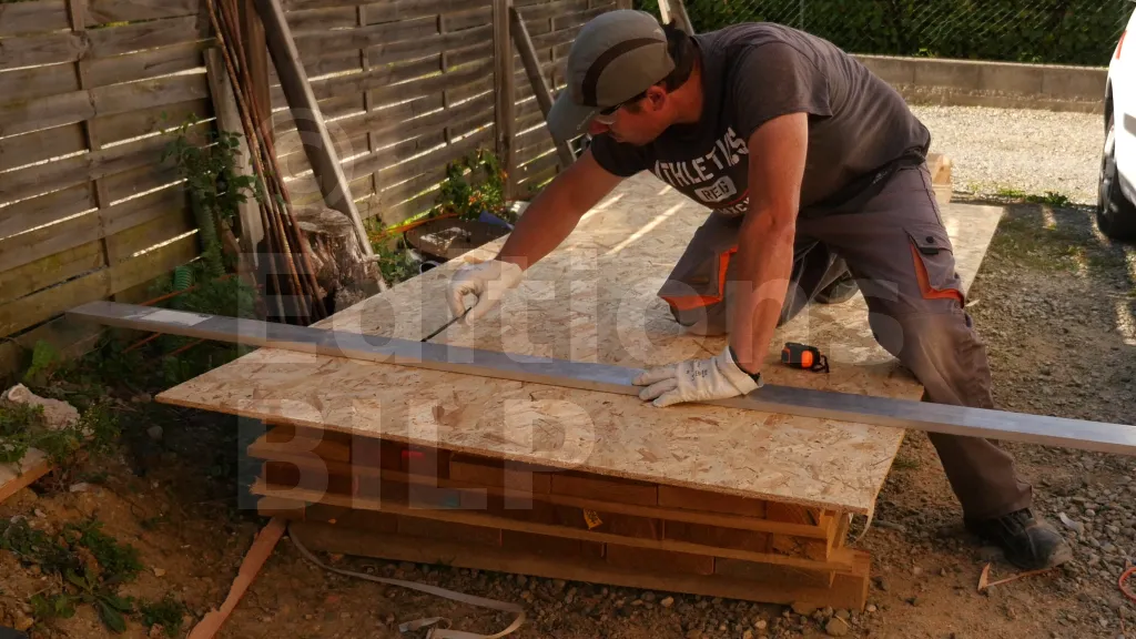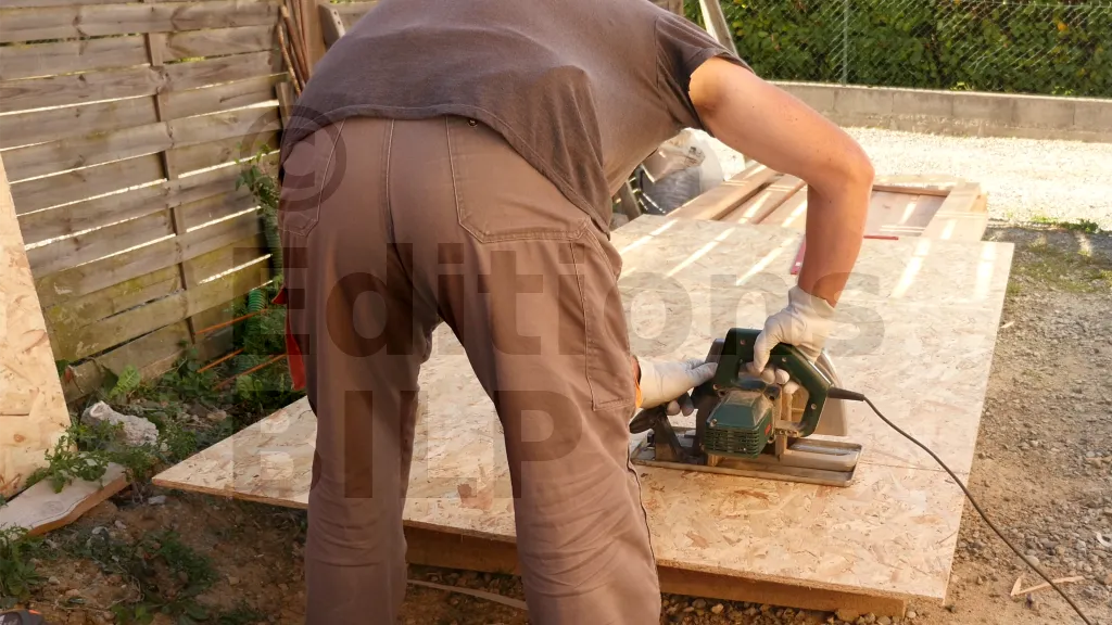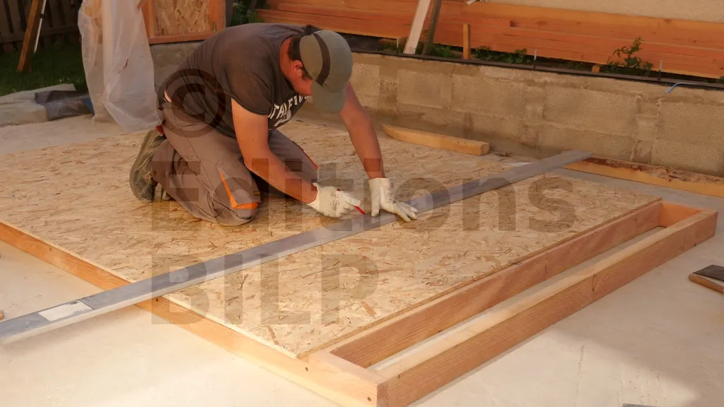 Entre chaque panneau, il faut laisser une espace d’au moins égale à 4 mm pour permettre la dilatation ou le retrait du bois. Pour cela insérez une cale plastique entre les panneaux pour garder cette espace.