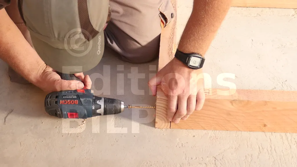 Nous utilisons trois vis D8L100 pour fixer les montants d’extrémités sur la lisse basse et une seule vis D8L100 par montant pour fixer les montants intermédiaires.