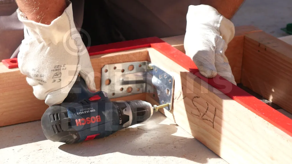 L’équerres renforcées ABR 105 est fixée contre le montant et la lisse basse avec des vis pour connecteurs.