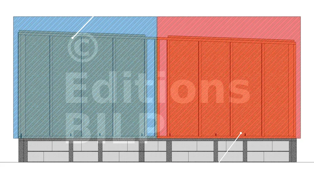 Vu l’ampleur du mur et les moyens dont nous disposons pour le montage, le mur est divisé en deux panneaux. Le premier panneau à être mis en place est celui qui est hachuré en bleu. Une fois que les deux panneaux sont en place, ils sont fixés ensemble à l’aide de boulons au niveau de leurs montants adjacents.