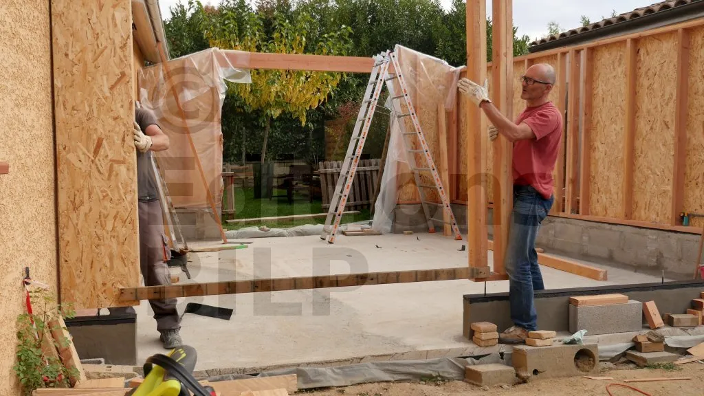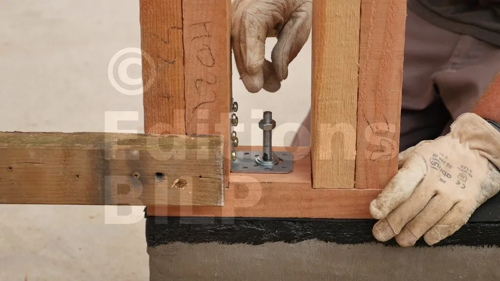 Les appuis des linteaux sont renforcés par des équerres. Les équerres contribuent également au contreventement de la structure jusqu’à la pose des panneaux de contreventement et au montage de la structure.