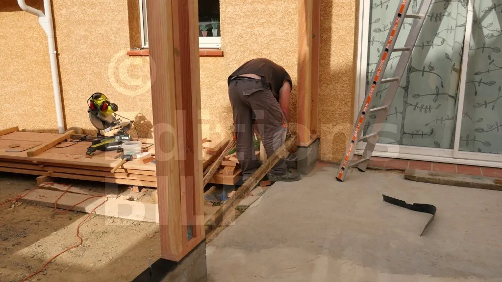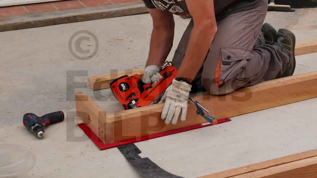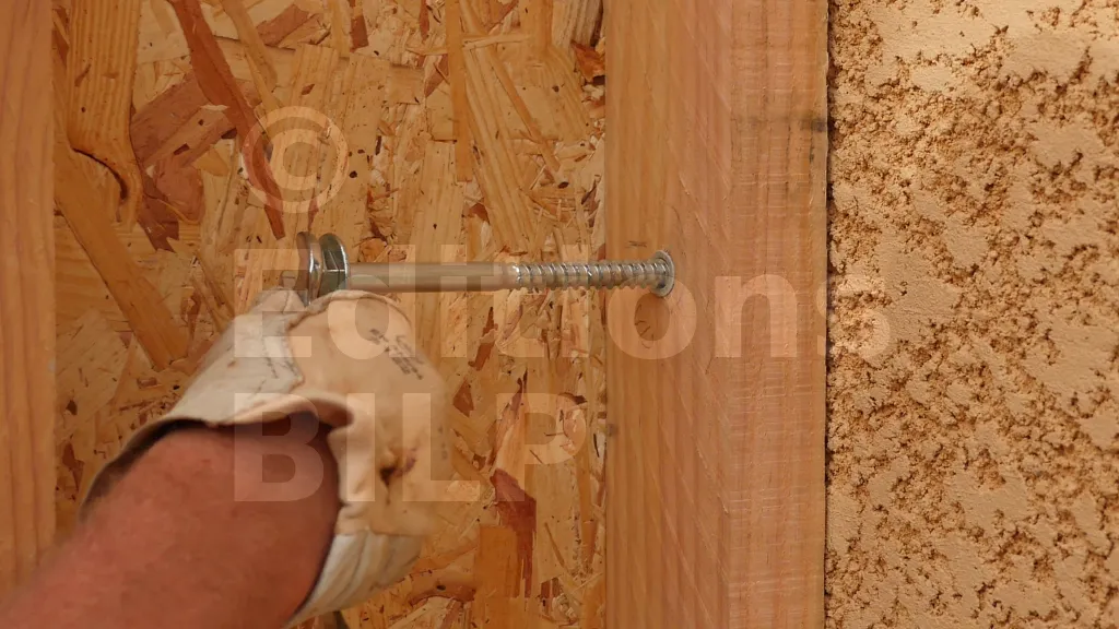 Après avoir fixé les deux linteaux ensemble à l’aide de serre-joints, ils sont ensuite fixés aux montants de renfort avec des vis bois structurelle, une vis par point de contact. Enfin, ils sont fixés entre eux à l’aide de pointes.