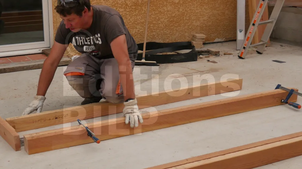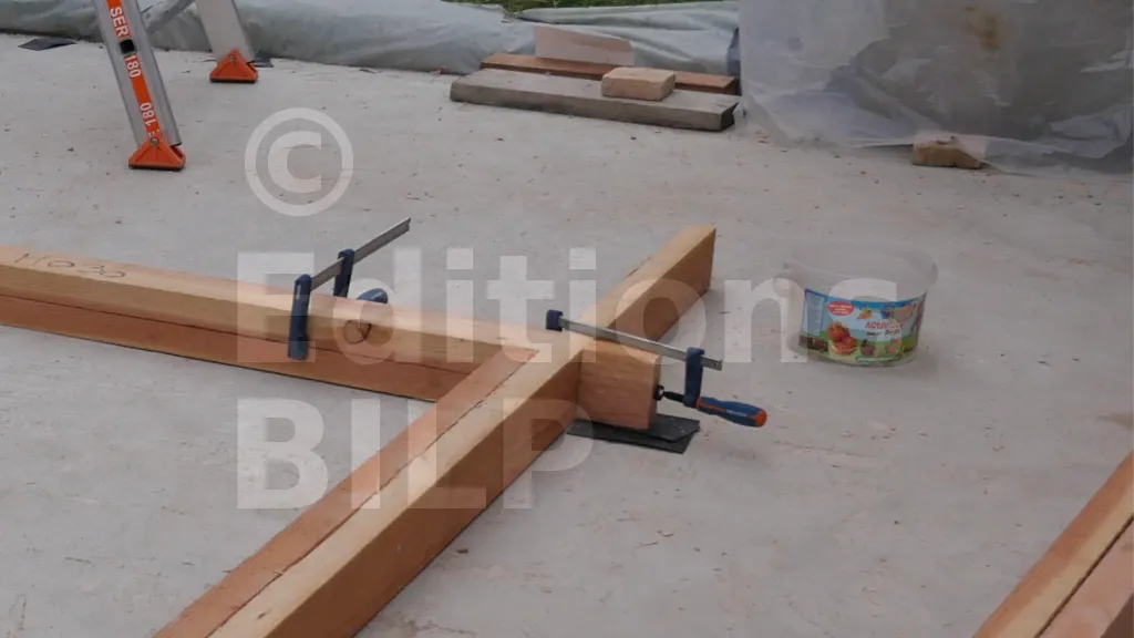 Les montants et leurs renforts sont provisoirement fixés ensemble à l’aide de serre-joints pour faciliter l’assemblage.