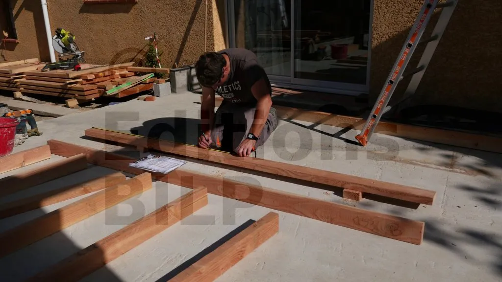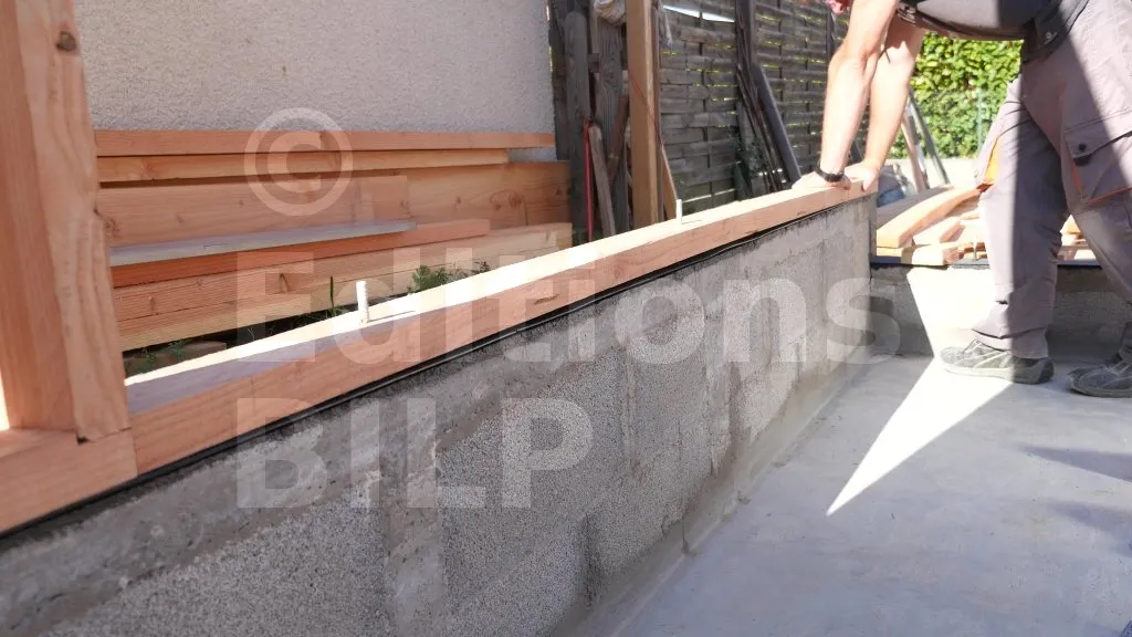 Puisque notre projet dépasse les 20m², il est obligatoire d’adopter cette technique de rainurage sur la lisse basse pour assurer une liaison perpendiculaire plus solide et précise.