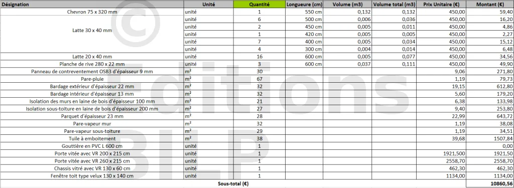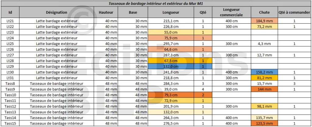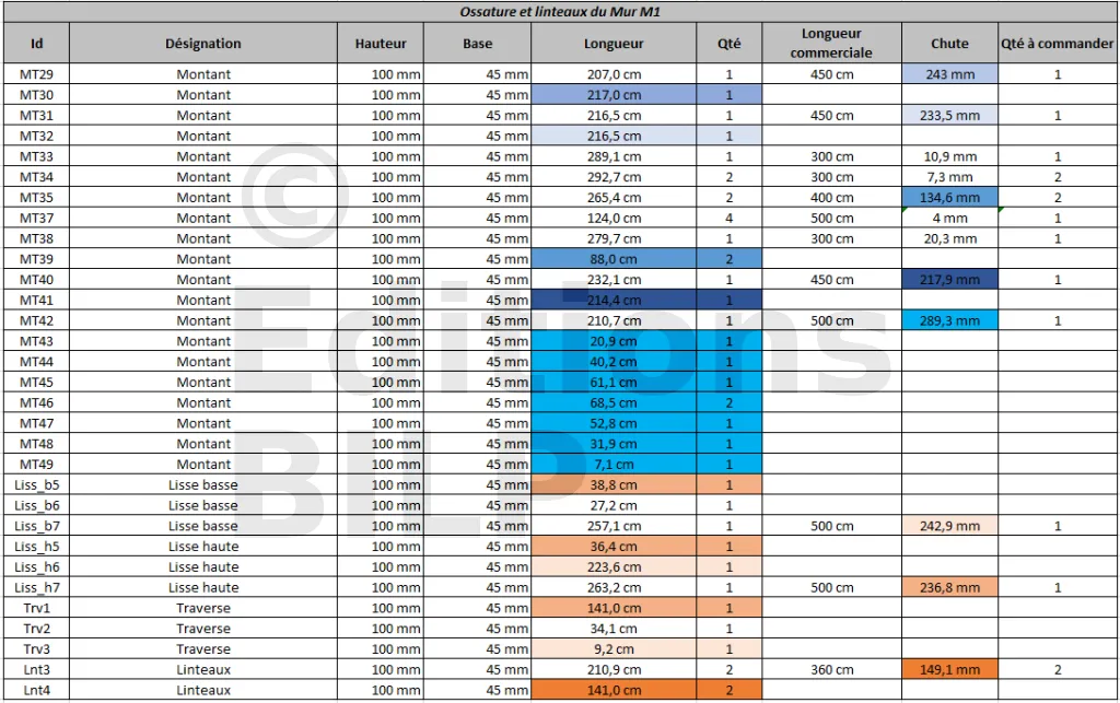Exemple : la longueur de la lisse basse (Liss_b7) est de 257,1 cm, il est possible de commander ou d’acheter une pièce de bois avec une longueur de 260 ou 270 cm pour la réaliser. Or sur la liste des pièces d’ossature, il y a des pièces de même section et de même nombre que la lisse (Liss_b7) avec des petites longueur :