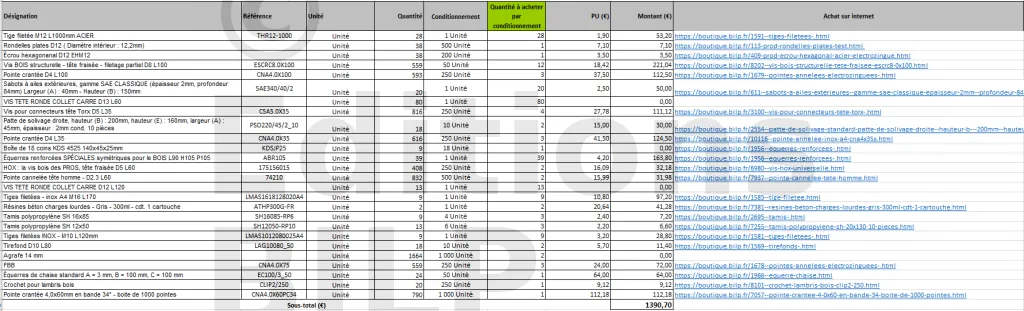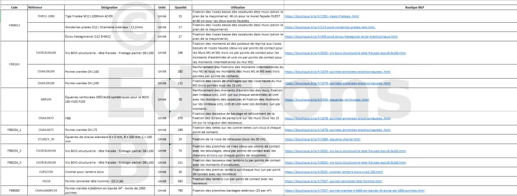 Le choix des élément de fixation garantisse la solidité de l’ouvrage. Afin d’éviter les vas-et-viens pour les manques sur la quantité de la quincaillerie il faut être minutieux lors de la quantification. Sur chaque projet de BILP, l’utilisation de chaque élément de la quincaillerie est mentionnée dans la feuille de calcul ainsi que des liens pour les commander. Pour vous aider à choisir vos quincailleries, vous pouvez consulter la rubrique sur les fixations. Vous pouvez également confier à BILP la conception de votre projet.