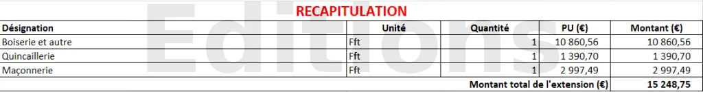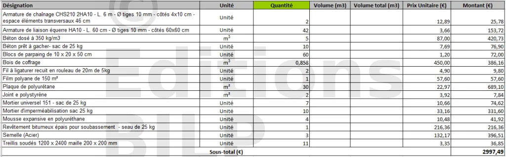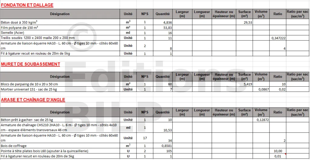 La liste des matériaux pour la fondation et la partie maçonnerie du projet