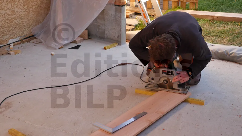 Les lattes ont une longueur plus courte que l’extension et les espacements entre les contre-lattes sont différents, ce qui nécessite des coupes pour aligner les extrémités des lattes d’une même rangée avec les axes des contre-lattes correspondantes.