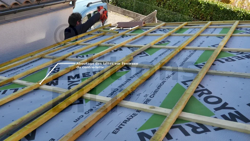 Les aboutages des lattes doivent être placés sur l’entraxe des contre-lattes afin d’assurer un bon appui sur les extrémités des lattes. Les aboutages doivent être disposés en quinconce sur chaque rangée pour ne pas fragiliser la structure.