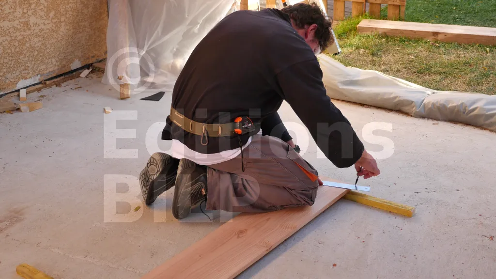 Pour obtenir des lignes de coupe précises, les planches sont maintenues provisoirement à leur emplacement à l’aide de serre-joints. Les intersections des planches sont ensuite marquées, puis les planches sont retirées.
