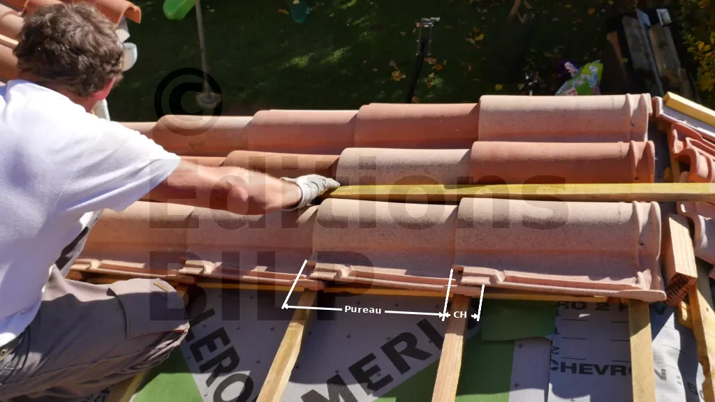 Le pureau (P) est la partie de la tuile qui est exposée à la pluie et sur laquelle l’eau s’écoule. La longueur du pureau est égale à la longueur des tuiles moins la longueur de chevauchement (CH), qui correspond à l’entraxe des liteaux, c’est-à-dire la distance entre les arrêtes supérieures des liteaux.