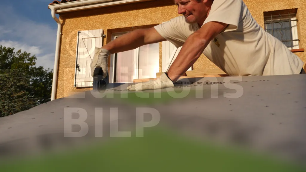 Commencez la pose par la bas de la pente. Il faut deux personnes pour la mise en place : positionnez le lé sur une extrémité du toit et fixez-le à l’aide d’agrafes sur les aboutages, puis déroulez-le jusqu’à l’autre extrémité.