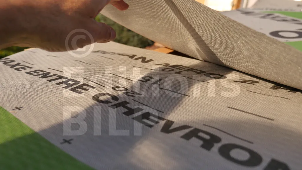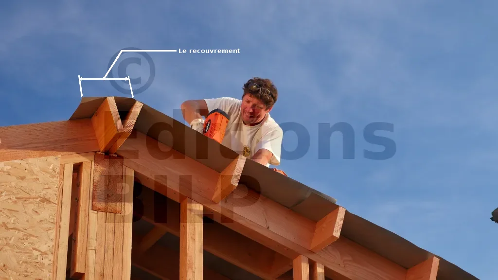 Le dernier lé doit déborder sur l’autre pente d’au moins 15 cm de largeur pour assurer l’étanchéité au niveau de la faîtière. Le dernier lé de l’autre côté doit chevaucher cette largeur.