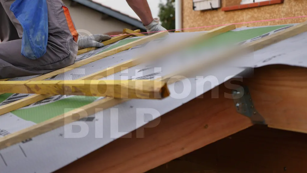 Les contre-lattes sur chaque pente ne doivent pas dépasser sur la pente opposée pour faciliter la pose de la lisse de rehausse. Pour cela, tirez un cordeau aux extrémités de la faîtière afin d’obtenir un alignement parfait. Enfin, coupez les contre-lattes pour les ajuster.