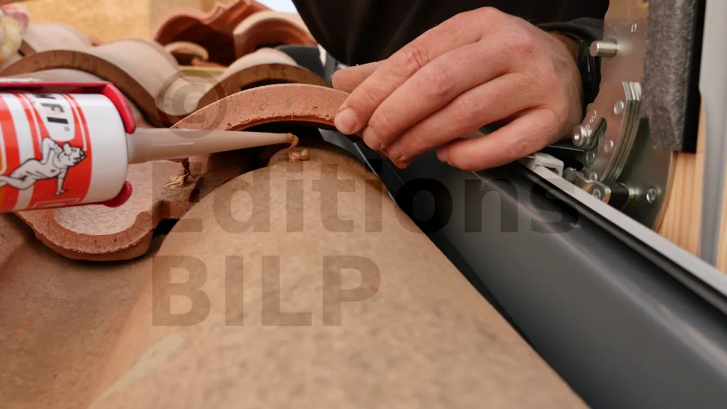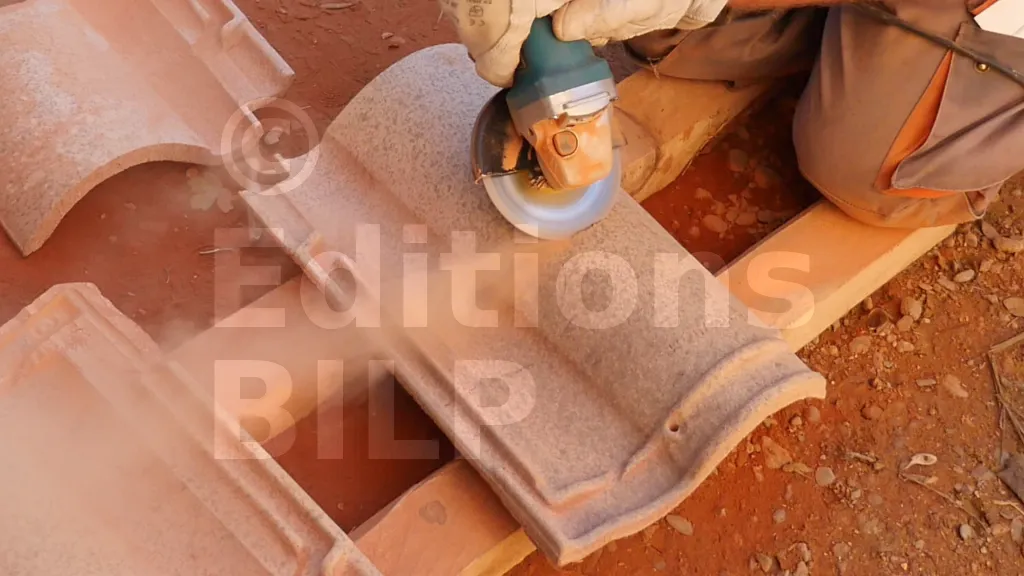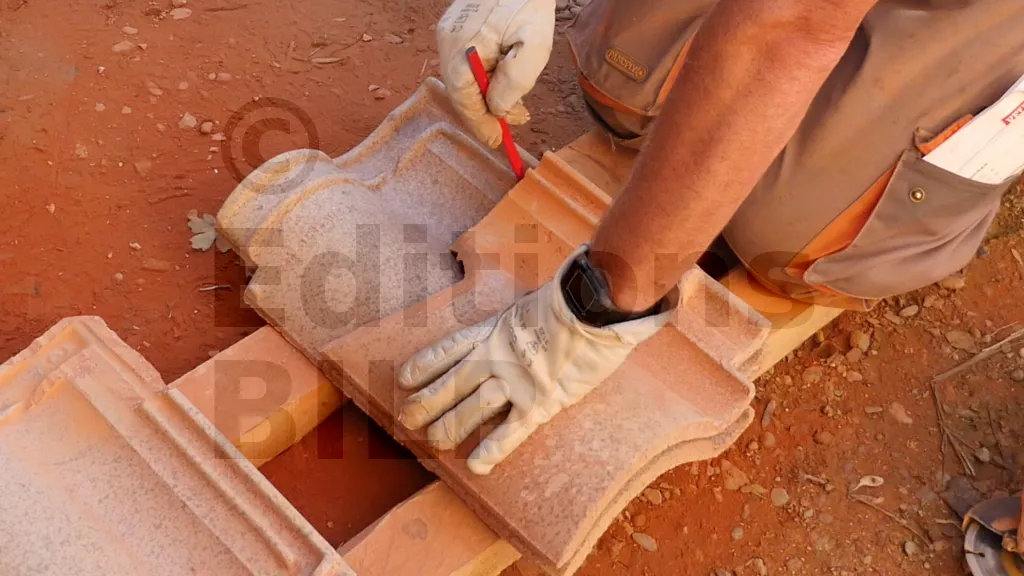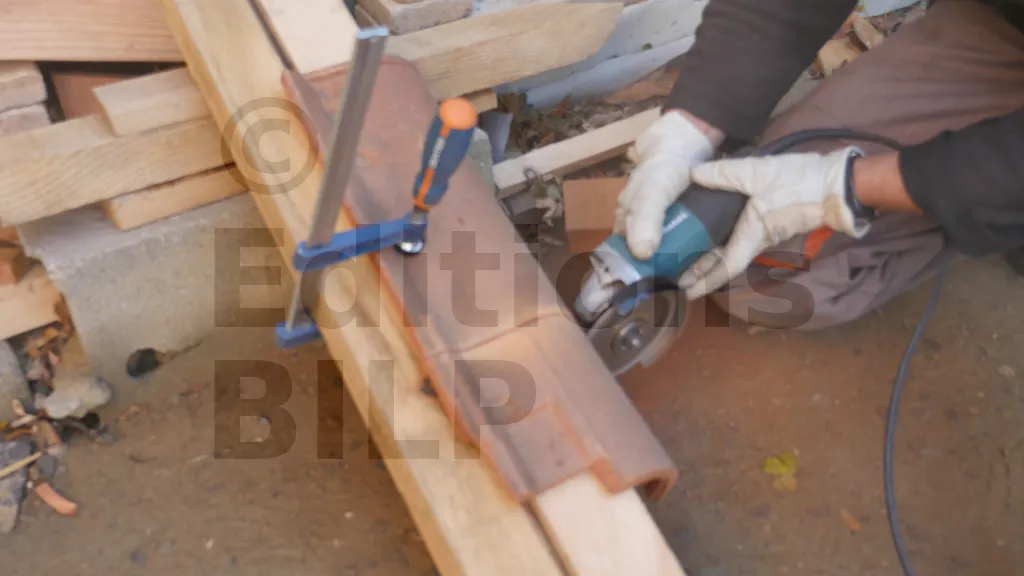 Les tuiles sont coupées en sifflet pour recevoir le raccord de toit. Pour ce faire, la meuleuse doit être inclinée à un angle approximativement égal à l’angle de la toiture. La partie basse de la tuile est utilisée.