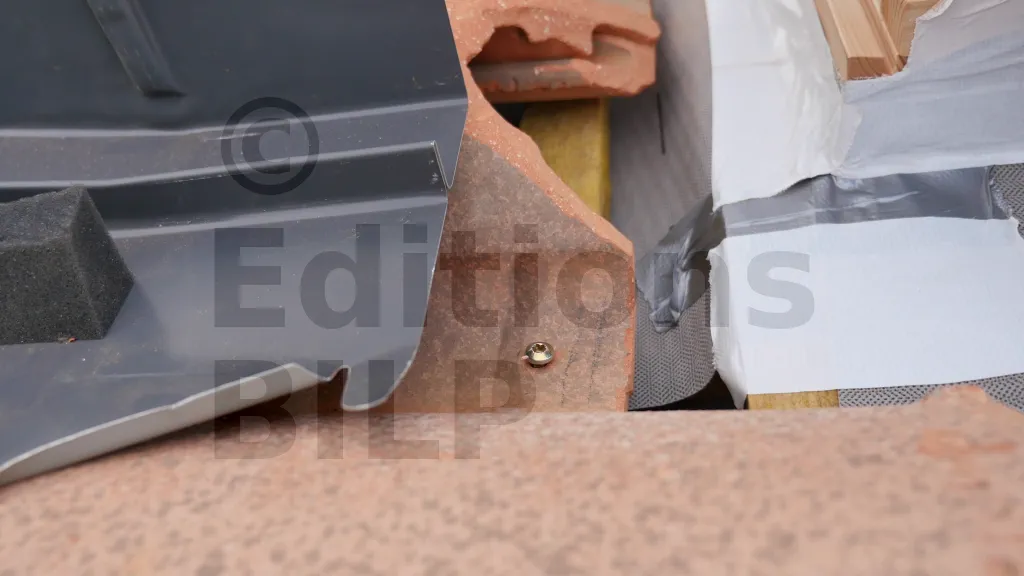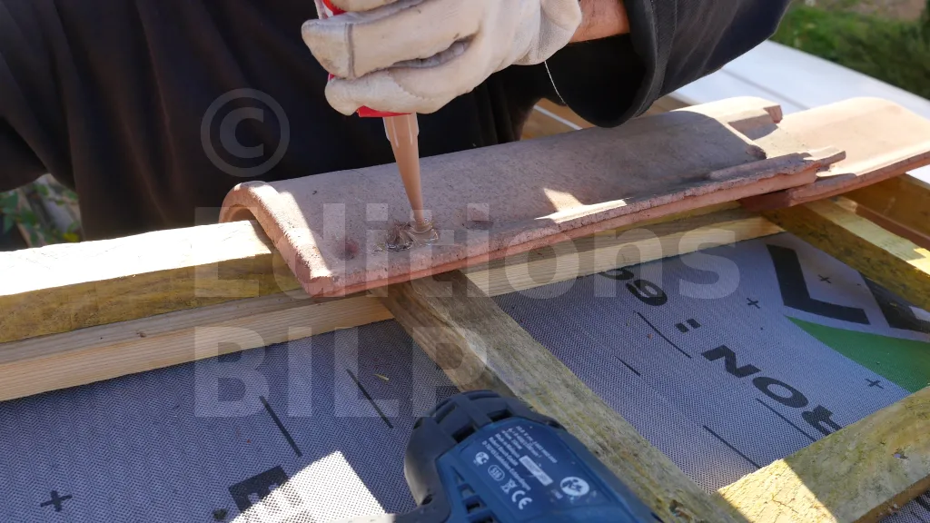 Les ergots des tuiles se trouve sur la partie supérieure des tuiles, mais c’est la partie basse qui est utilisée sur les coupes. Ainsi, les tuiles ne sont pas accrochées aux liteaux et il faut les fixer sur les liteaux avec des vis. Pour éviter les fissures, il est indispensable de pré-percer les tuiles.