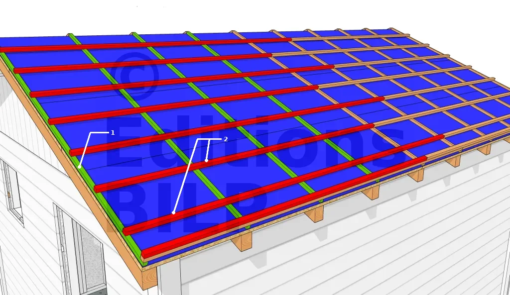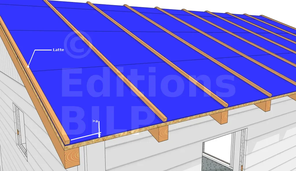La présence d’écran de sous-toiture permet d’abaisser de quelques degrés la pente minimale requise. L’écran (souple ou rigide) est fixé entre les chevrons et les contre-lattes. Il offre une aération à la toiture, et surtout, il a pour rôle de recueillir la neige poudreuse et d’évacuer les eaux de fonte. L’écran s’arrête au ras de l’égout.