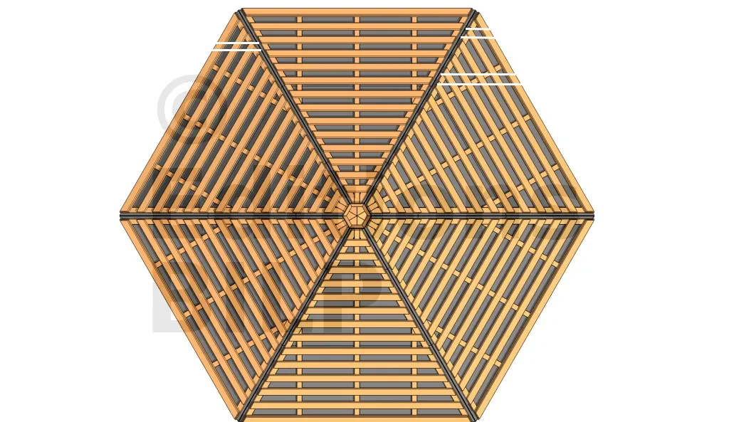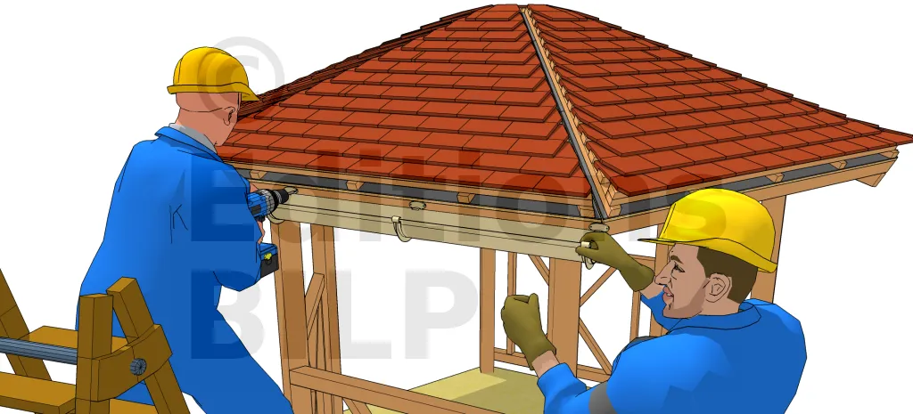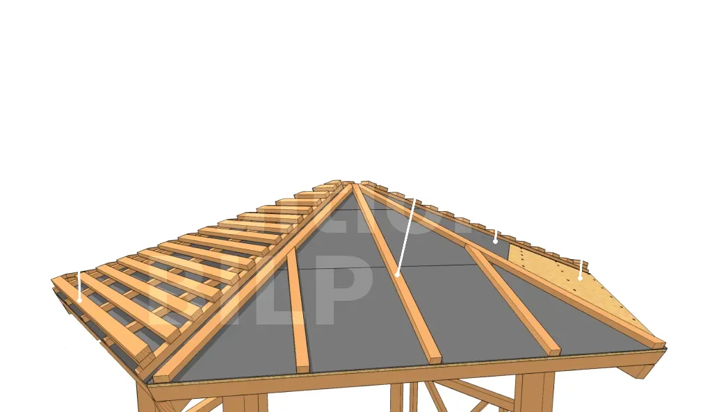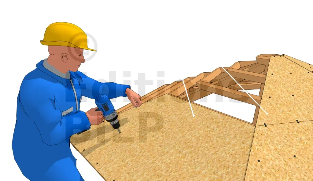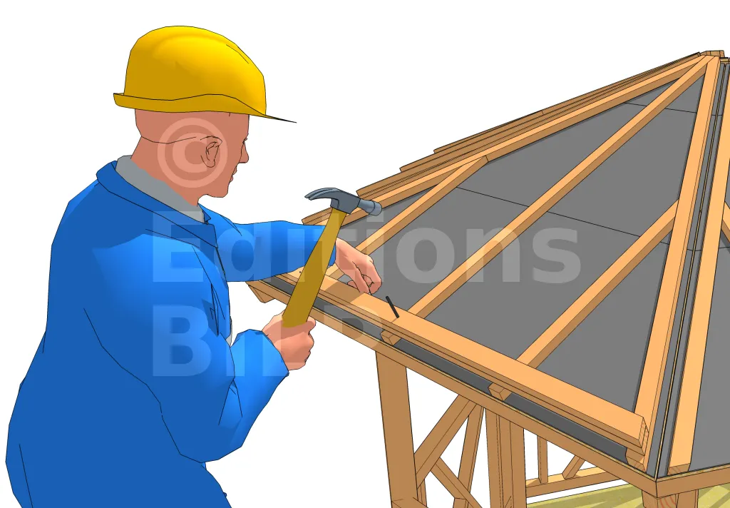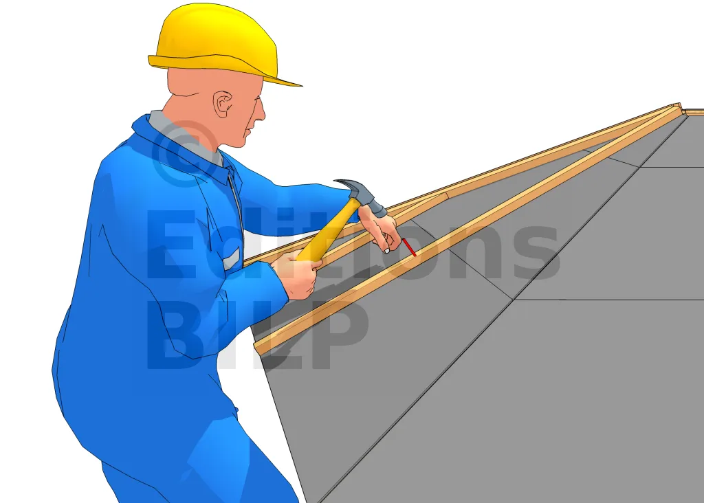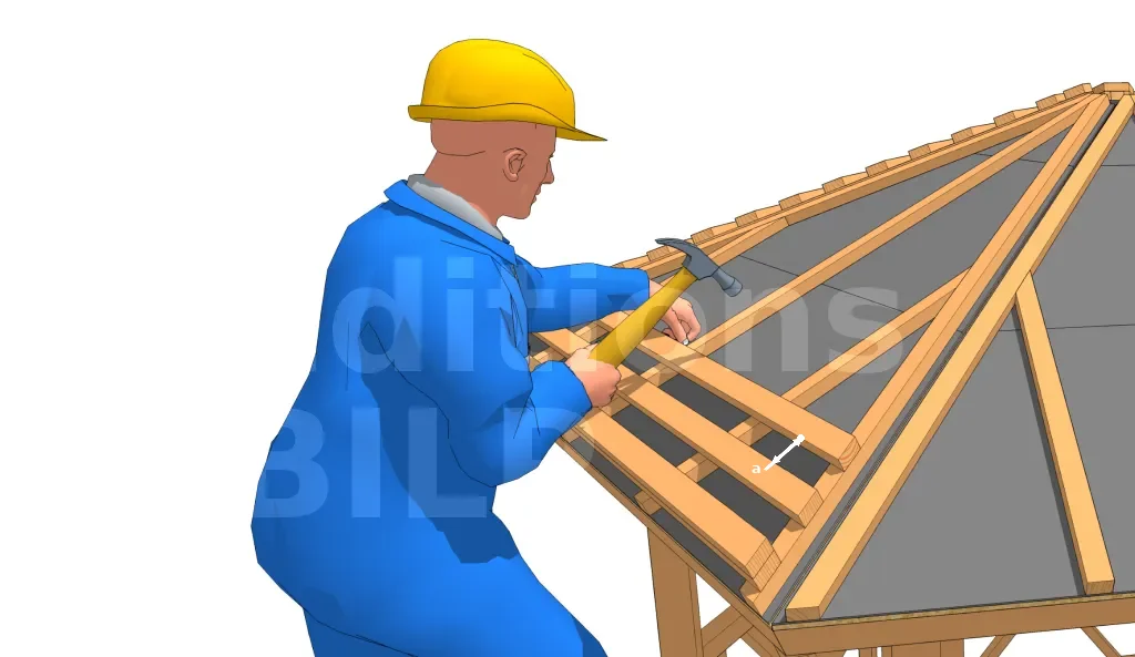 Les autres liteaux seront fixés parallèlement à la première rangée (avec une distance correspondante au pureau). Poser des gabarits entre chaque liteau pour éviter des erreurs et pour accélérer le travail. Assurez-vous de bien clouer sur toutes les intersections des liteaux aux chevrons. Répéter cette action jusqu’au sommet de la toiture (au faîtage). Puis couper à l’aide d’une scie les bouts de liteaux qui dépassent du bord, c’est-à-dire au niveau des rives latérales.