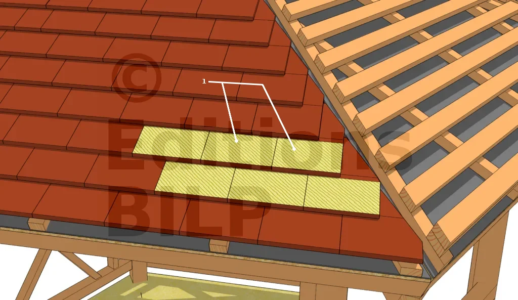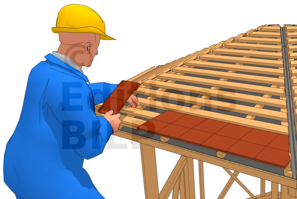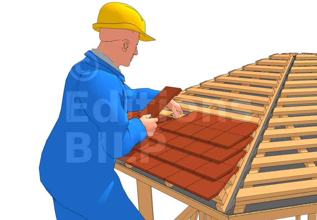Superposer les nouvelles rangées à celles qui sont déjà en place. Les tuiles seront fixées sur les liteaux par des ergots ou tenons. La pose de chaque rangée se fait à joints croisés, chacune des rangées sera donc décalée d’une tuile.