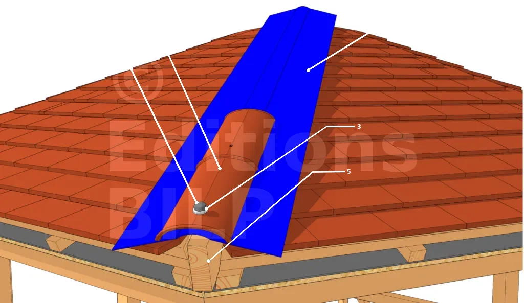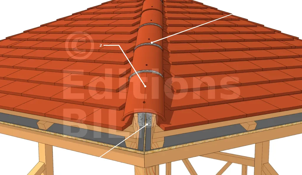 Ce type de pose de faîtage s’exécute évidement à l’aide de mortier. Le recouvrement se fait sur le rang de tuiles de sous-faîtage et débute par un fronton.