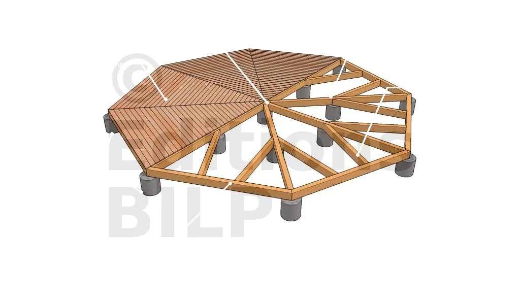 Cette plateforme est adaptée à des structures polygonales que sont les gloriettes, les gazebos et les kiosques. Elle est constituée de platelage en lame de terrasse ou de panneaux de bois et des solives. Si on se réfère d’une terrasse en bois, on est dans la même structure qu’une terrasse sur plots en béton.