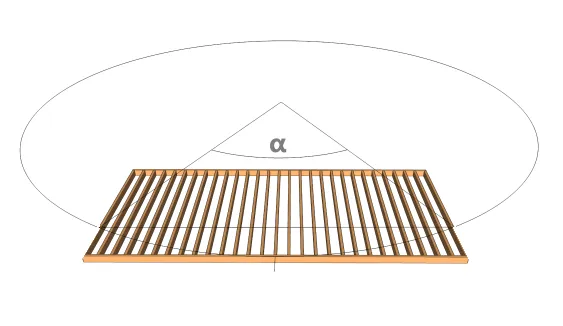 Calculons N > 90 / (2 x Arcos(1 – (10/180)) ). Soit N > 2,34. Nous prenons donc la valeur entière immédiatement supérieure, soit 3 solives-bordures.