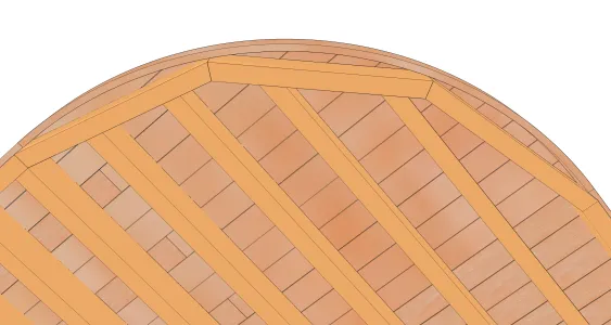 L’effet de courbe est produit d’une part par la coupe en arrondi des lames (ou panneaux) , d’autre part par le bandeau qui est fixé en forçant sa courbure. Mais la structure sous-jacente est très importante. Nous allons placer un certain nombre de solives en bordure, pour suivre autant que possible la courbe. La quantité de solives bordures et leur longueur sont à calculer. Il faut absolument faire un plan. Pas question d’improviser sur le chantier.