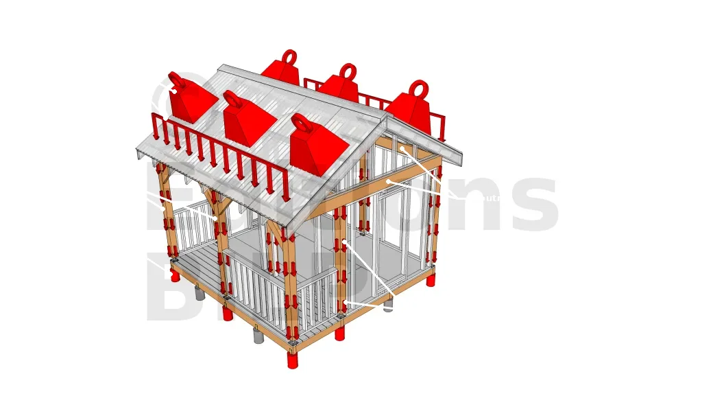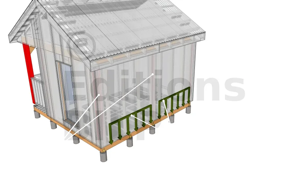 Prenons comme exemple ce modèle d’extension qui a été réalisé dans le département de l’Isère avec une altitude de 800 m. Ce modèle présente des poteaux et des pannes qui vont reprendre et transmettre les charges venant de la toiture. De ce fait, les poutres porteuses périphériques ne supportent plus que le poids du mur et du plancher.