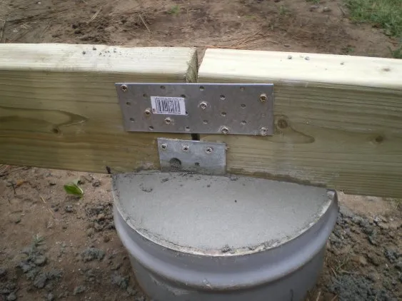 On peut aussi, comme dans l’exemple ci-dessous, fixer les connecteurs à la solive puis couler le béton dans un second temps. Le tube PVC peut servir de support à la solive avant coulage du béton. Cela signifie qu’il a été soigneusement mis à niveau. Pour cela, on peut sceller les tubes PVC dans la partie enfouie du plot, puis les mettre tous à niveau ultérieurement en s’aidant d’un niveau laser ou à fiole. Il est recommandé de ne pas remplir le plot jusqu’au bord (contrairement à l’exemple ci-dessous), car dans ce cas la solive est collée au béton, lui faisant courir un risque de pourrissement prématuré.