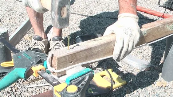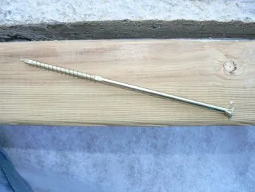 Si la solive fait moins de 10 cm de hauteur, il est possible d’utiliser des chevilles à frapper. La cheville est insérée au travers de la solive puis frappée. On dispose quelques cales PVC sous la solive pour éviter qu’elle ne soit en contact direct avec le béton. Dans un premier temps, on peut fixer uniquement les deux extrémités de la solive, et cela pour toutes les solives. Puis, quand tout est bien aligné, on place les fixations du milieu des solives, sans dévisser les chevilles d’extrémité.