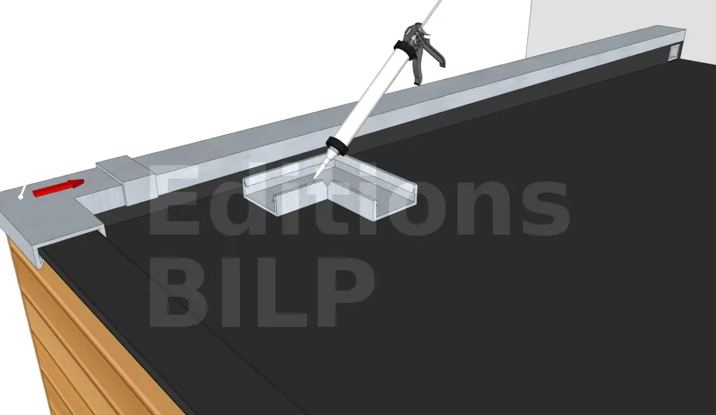 Pour commencer, vous aller mettre du silicone à l’intérieur de la couvertine d’angle. Puis, sous l’éclipse qui a été placé précédemment, vous allez également y mettre du silicone. Enfin, vous allez appuyer fortement sur la couvertine d’angle pour la faire adhérer à la colle tout en la coulissant sous l’éclisse.