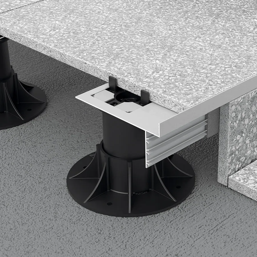 Les dalles sont posées aux quatre coins sur des plots constitués de taquets réglables en hauteur ou de plaquettes en superposition. L’embase des plots doit être suffisante afin qu’ils ne puissent pas s’imprimer dans les membranes bitumineuses sous l’effet du fluage par temps chaud. Avec cette méthode, l’évacuation des eaux se fait sous le dallage qui, de ce fait, sèche rapidement après la pluie. La hauteur des plots est de 2,5 cm au minimum. Ce système est conseillé pour l’aménagement des parties dédiées à la circulation piétonne des toitures-terrasses accessibles.