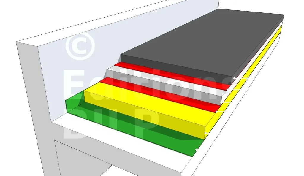 - Couche supérieure : une membrane résistante à la pénétration des racines soudée à chaud